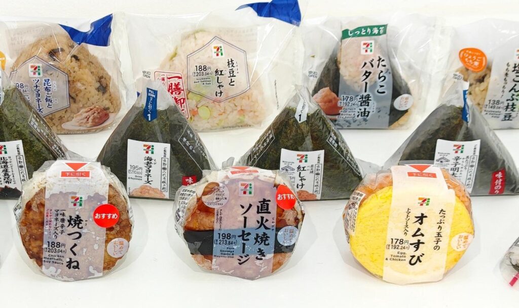 Onigiri is a Japanese rice ball. It is made with white rice and wrapped in seaweed (nori). Inside, there is a delicious filling. It is a quick, easy, and healthy snack or meal. 7-Eleven has many flavors to choose from. Most cost around ¥130–¥220.